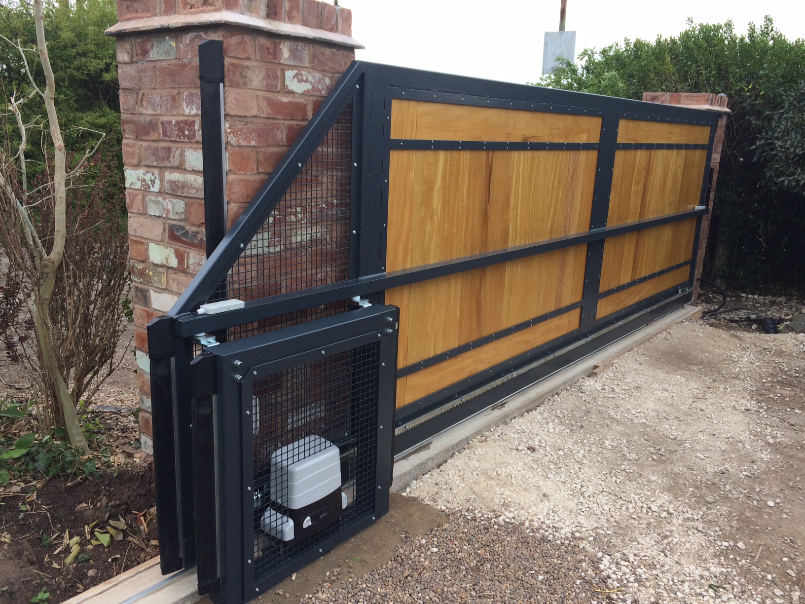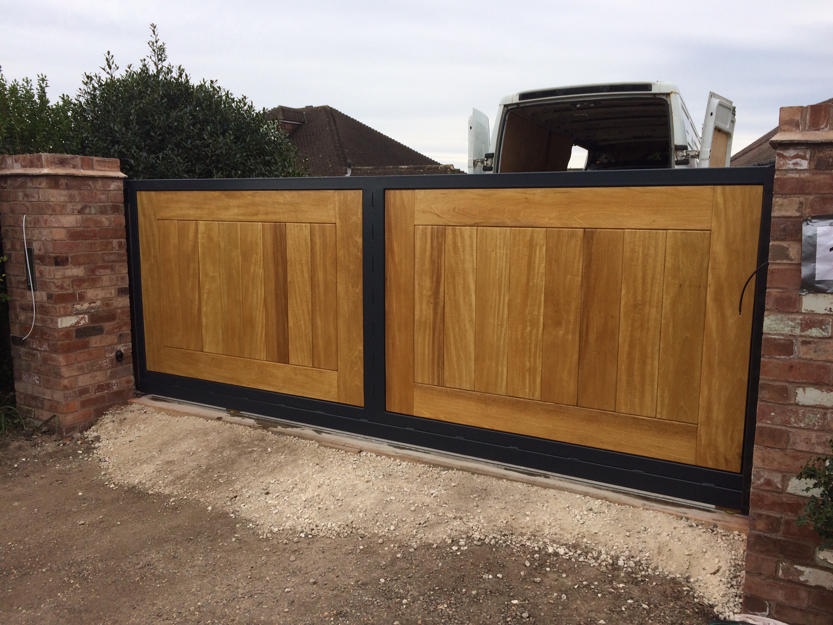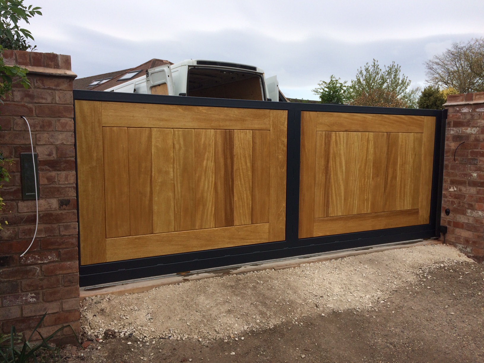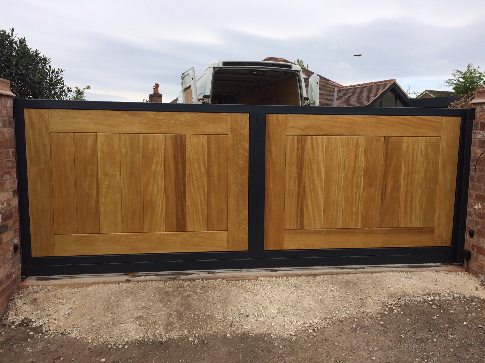 We are pleased to showcase this stunning sliding automatic gate with chunky steel frame and special Idigbo wood in-fill panels.